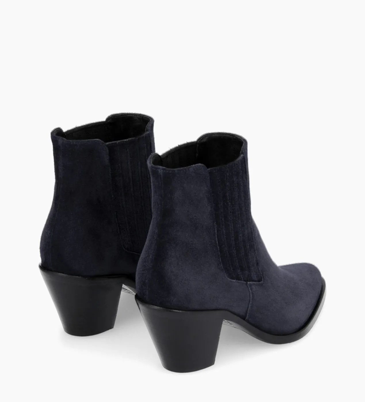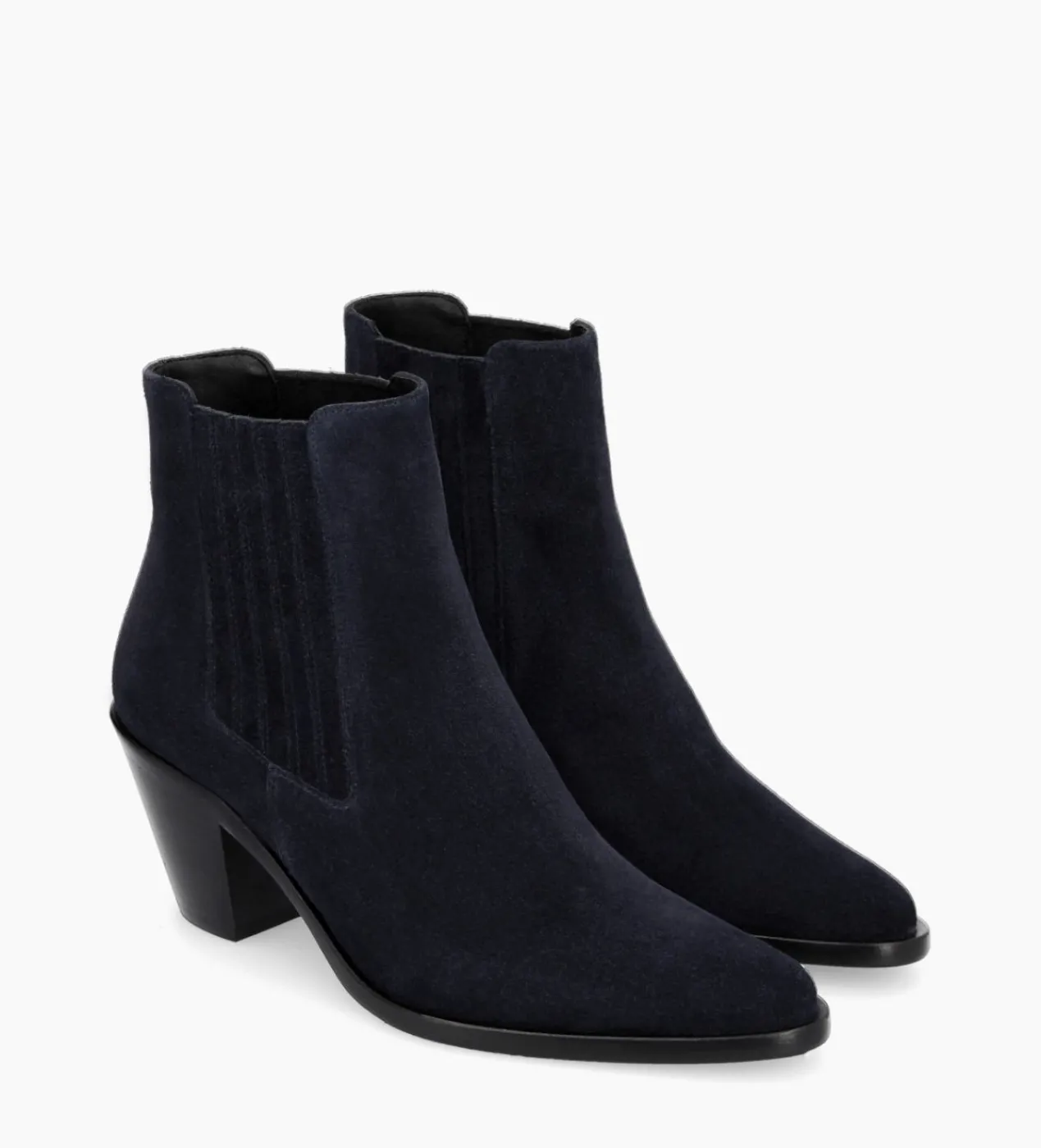 Avec les JANE, Free Lance mixe élégamment les codes du Chelsea et de la bottine western. Fabriquées en France dans un cuir velours marine, elles affichent une pointe effilée et un talon en biseau. Sur les côtés, de larges élastiques recouverts de cuir assurent un enfilage facile. Ces bottines reposent sur une semelle en cuir avec talon de 7 cm offrant une démarche confortable.