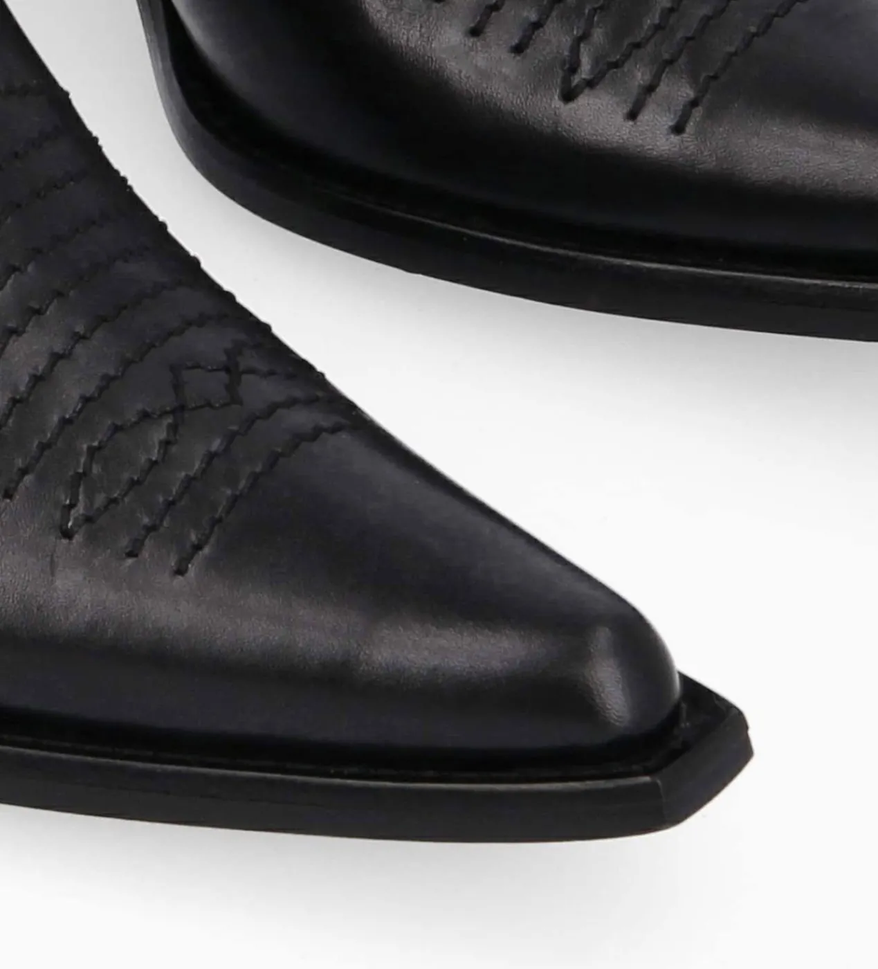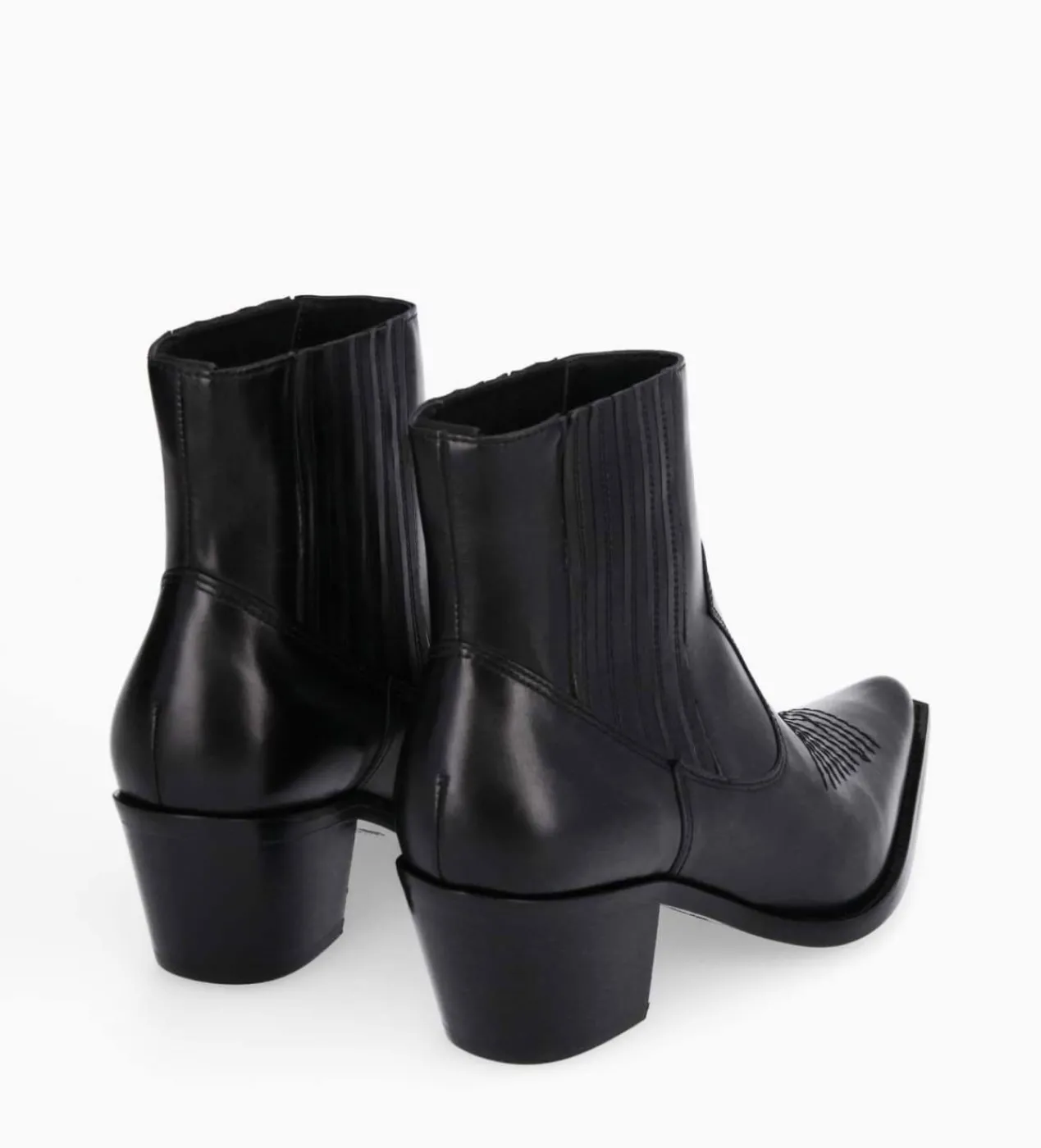 Les Simone se dévoilent dans une version épurée et intemporelle dans un sublime cuir brillant noir. Ces bottines citadines aux lignes acérées, revendiquent fièrement leur inspiration western, avec leur bout franchement pointu posé sur une trépointe graphique, leur talon en biseau et leurs surpiqûres caractéristiques des bottes de cow-boys. Fabriquées en France avec tout le savoir-faire Free Lance, ces santiags vous offrent un confort exceptionnel et s’enfilent facilement grâce à leurs élastiques latéraux recouverts de lamelles de cuir. Ces bottines permettent d’affirmer votre style avec détermination et une pointe d’audace.