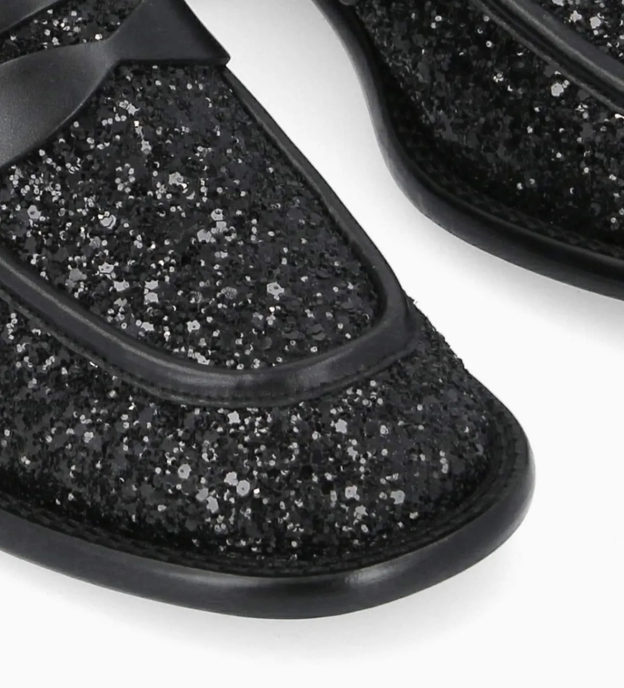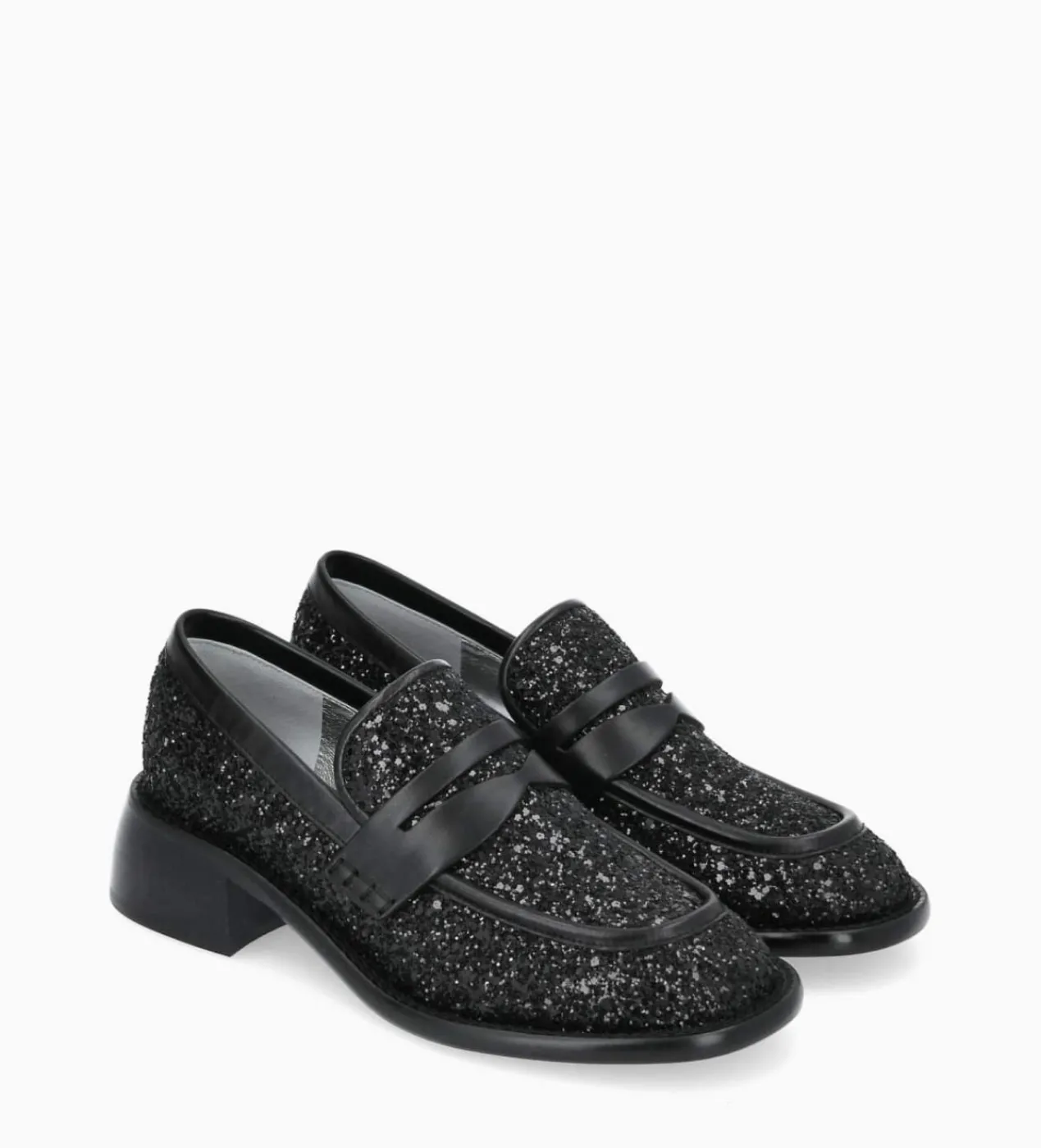 Les Anaïs se parent d’un habit de lumière pour ajouter une touche d’éclat aux tenues les plus chics. Confectionnés dans une somptueuse toile glitter noire, sublimée par un bandeau en cuir lisse, ces mocassins se réinventent avec sophistication. Fabriqués en France avec tout le savoir-faire de Free Lance, ils arborent une silhouette résolument contemporaine avec leur bout carré arrondi, leur trépointe débordante et leur large talon graphique.
