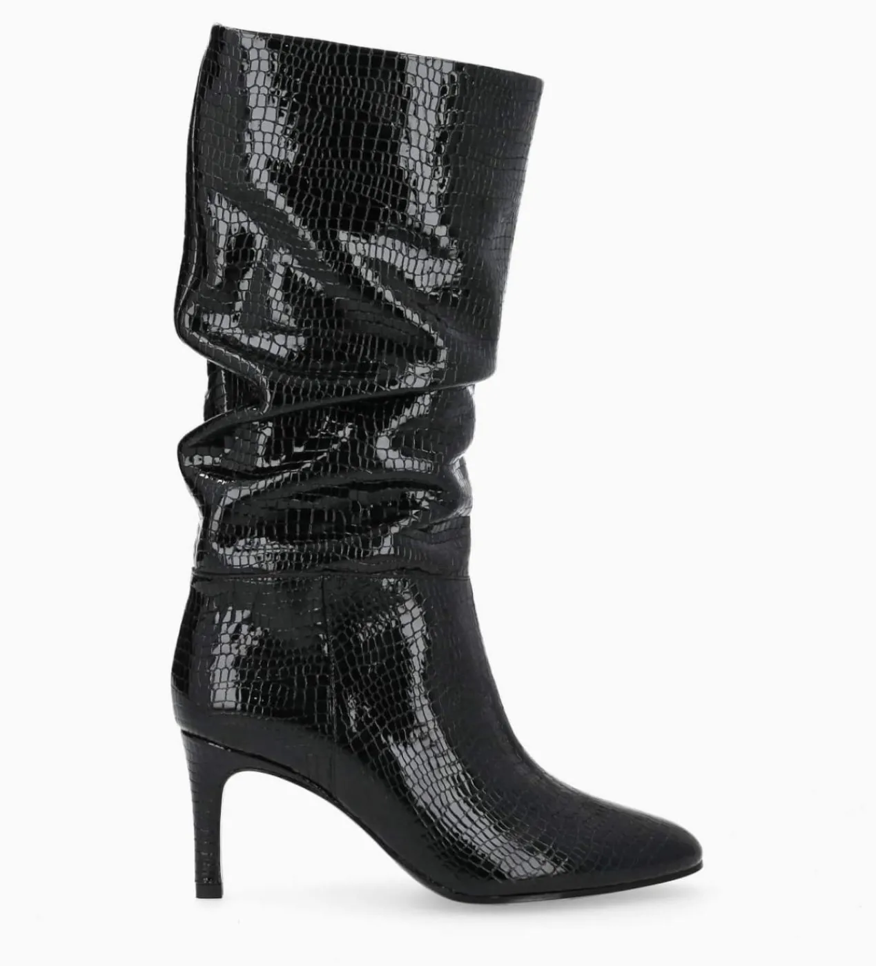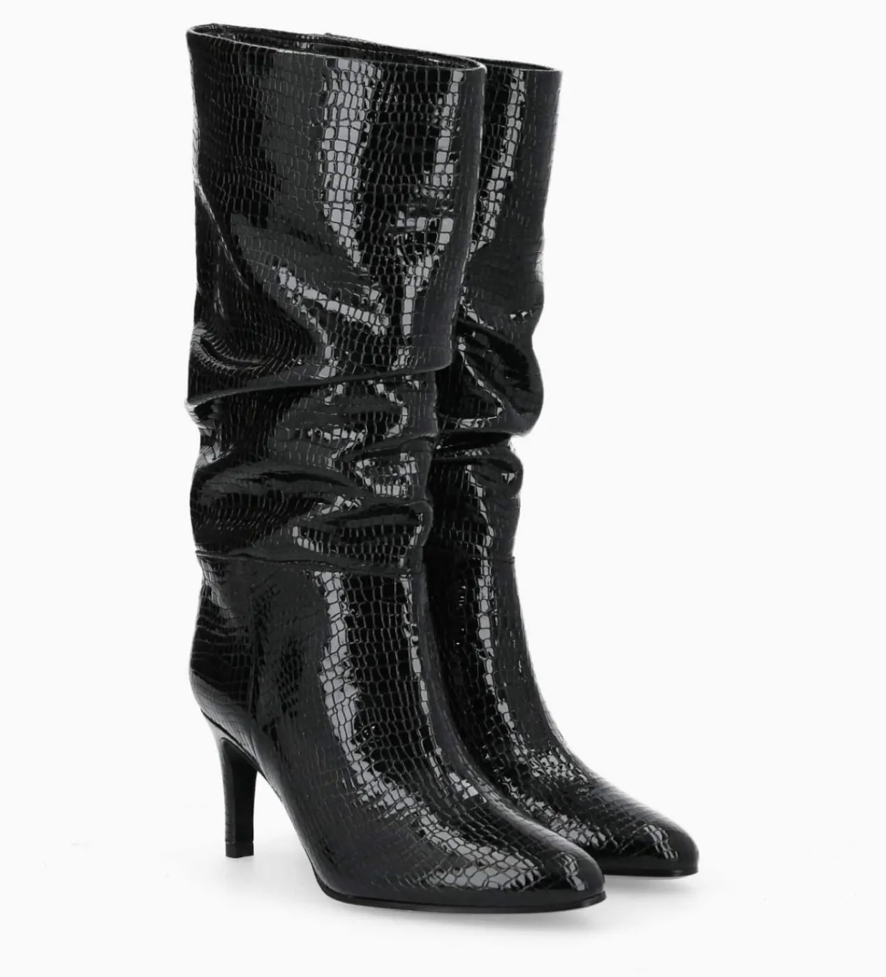 Botte mi-haute plissée en cuir imprimé serpent noir