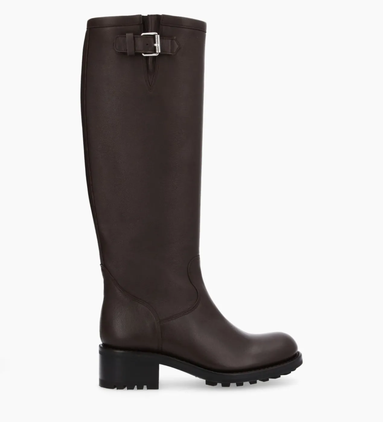 Résolument épurées, les iconiques bottes Biker geronimo s’affichent dans un magnifique cuir grainé marron. Offrant une silhouette aussi racée que féminine, elles sont ornées d’une boucle martelée en haut de la tige. Ces bottes reposent sur un talon de 50 mm atténué par une semelle crantée de 20 mm pour un confort idéal. Fabriquées au Portugal selon la technique du cousu Goodyear, elles s’enfilent facilement.