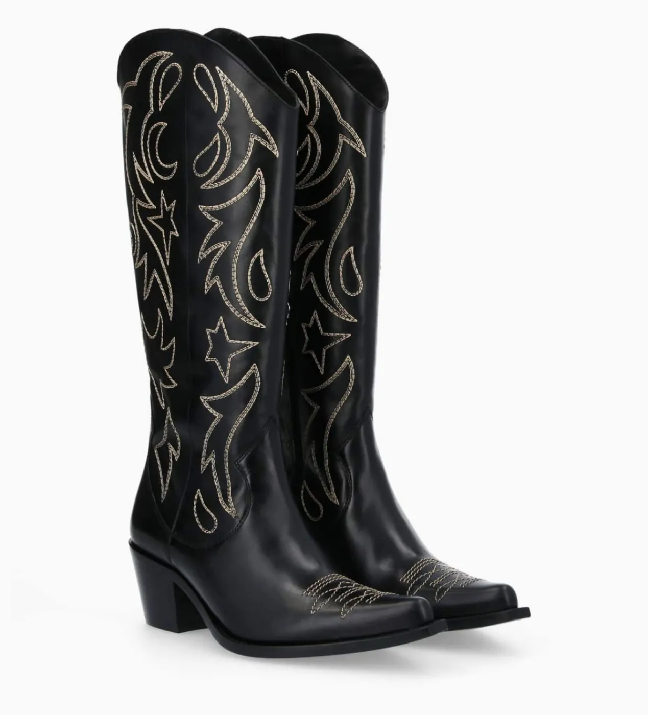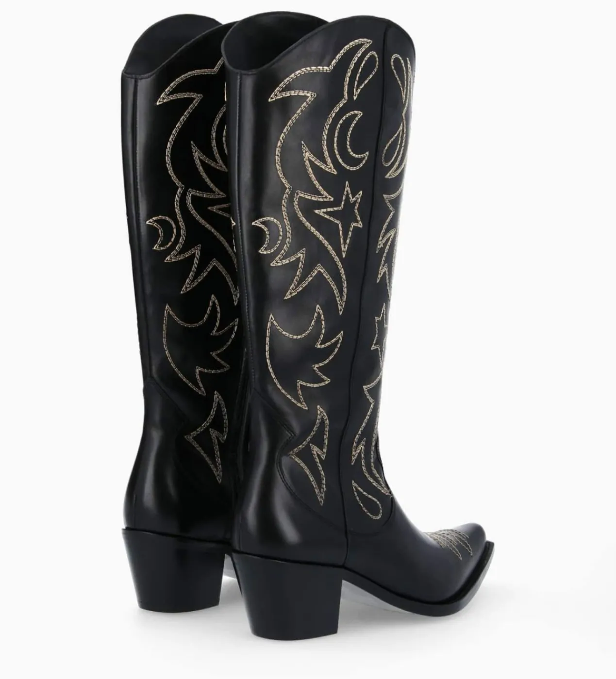 Cette nouvelle Ruby conjugue ses origines western à des lignes urbaines et contemporaines. Une botte en cuir brillant noir aux lignes assumées : bout franchement pointu, trépointe débordante graphique et talon biseauté à souhait pour amorcer la saison de plain-pied. Un jeu de surpiqûres brodées réalisées à la main dans nos ateliers français rythme l’allure. Avec leur talon à la cambrure parfaite elles offrent beaucoup de confort.