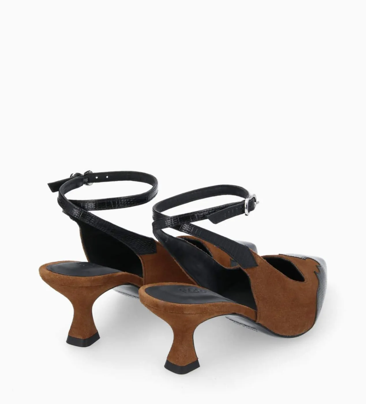 Escarpins slingback en cuir imprimé lézard noir et cuir velours brun