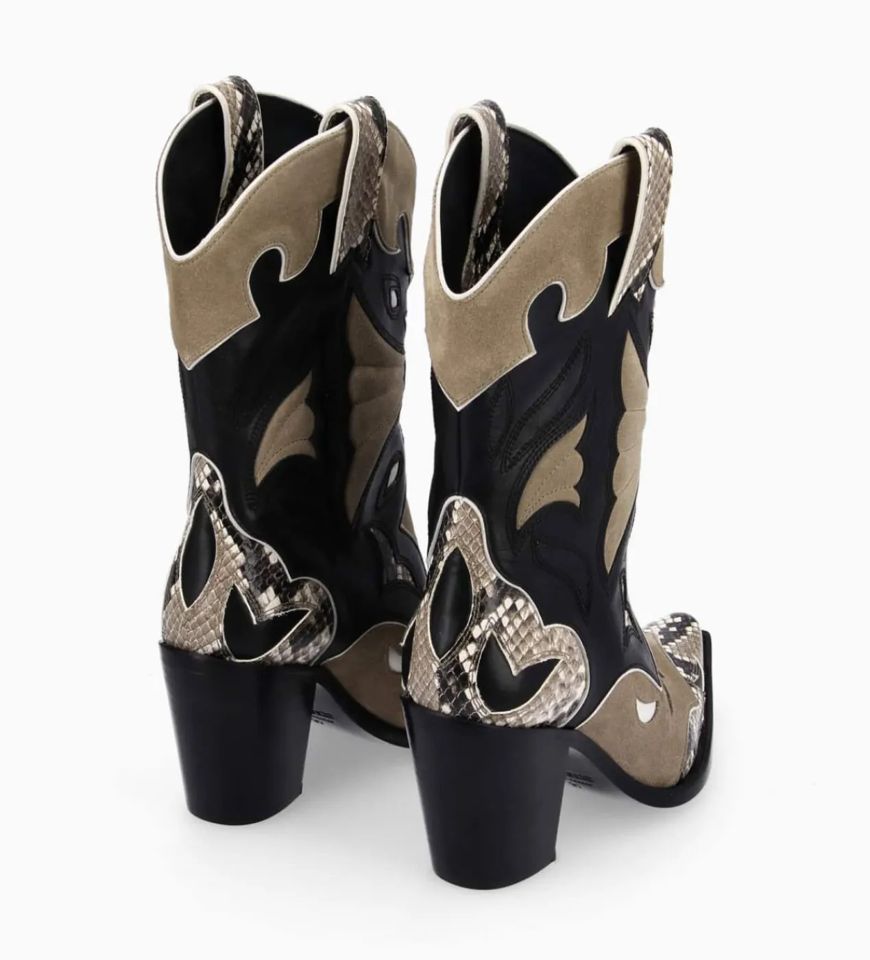 Bottines western beige et noir en cuir lisse, cuir velours et cuir imprimé serpent