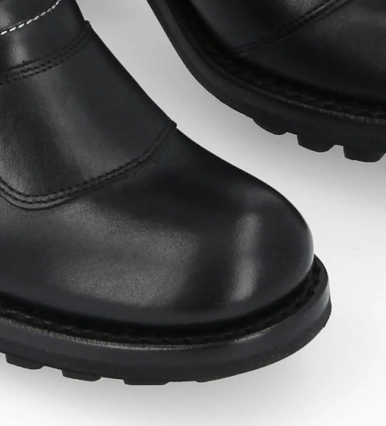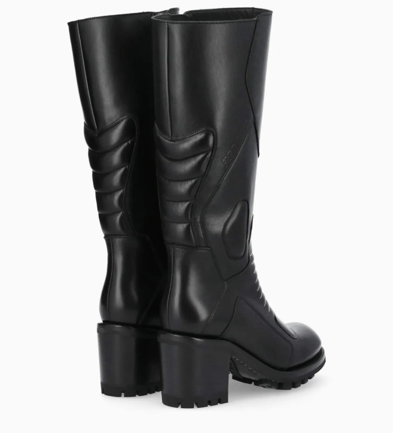 La botte se pare de détails inspirés de l’univers biker avec la Thelma dans une version en cuir lisse noir. Elle dévoile un jeu d’empiècements matelassés et de surpiqûres empruntées aux blousons des motards. Reposant sur l’emblématique semelle crantée de FREE LANCE et confectionnée selon la technique du cousu Goodyear, la Thelma allie une allure audacieuse à une résistance inégalée. Elle apporte une esthétique singulière à chaque tenue.