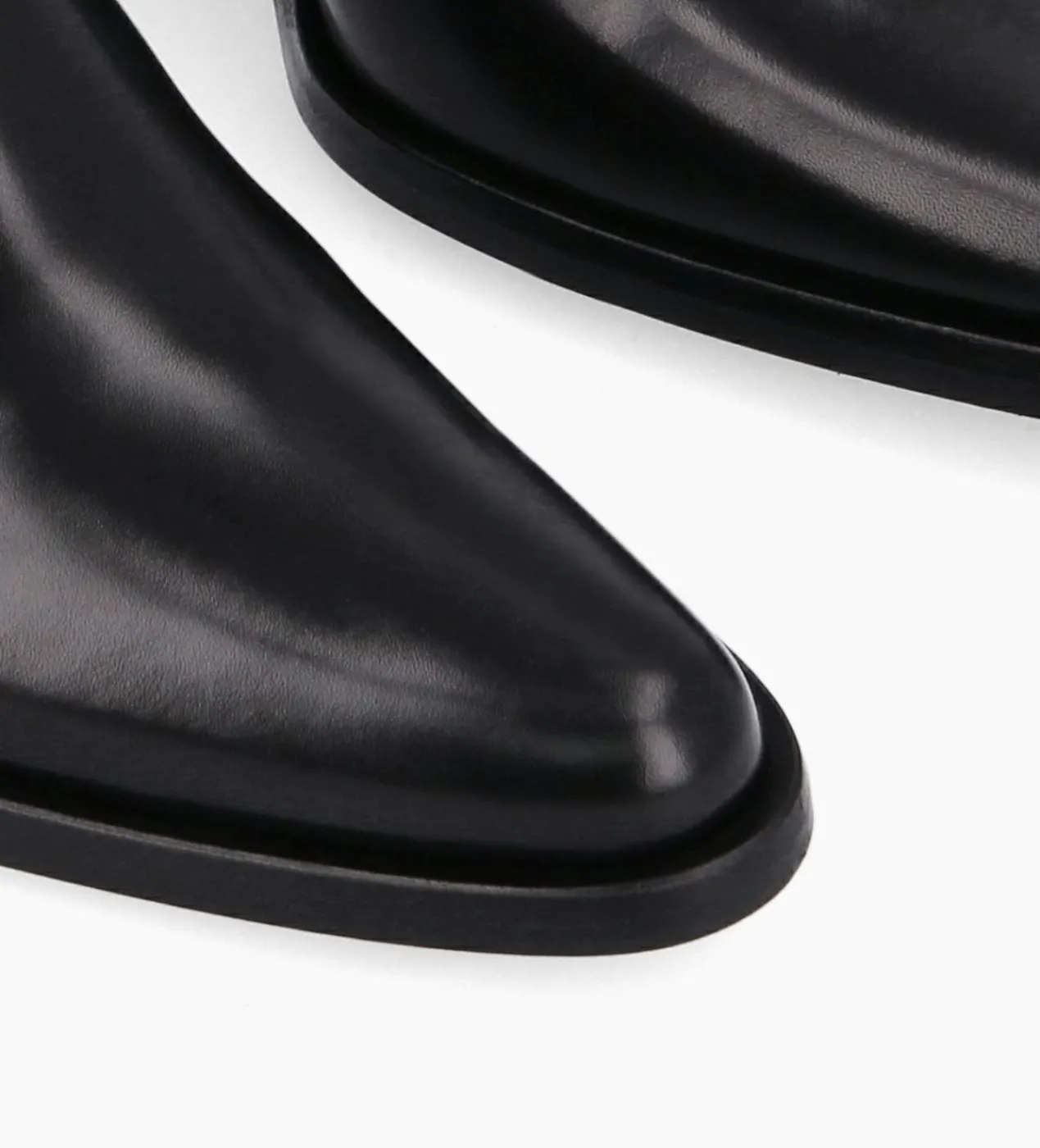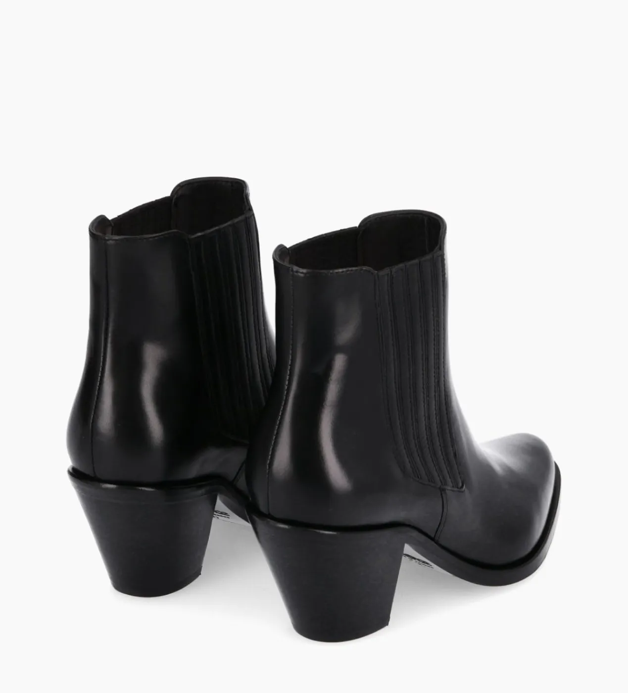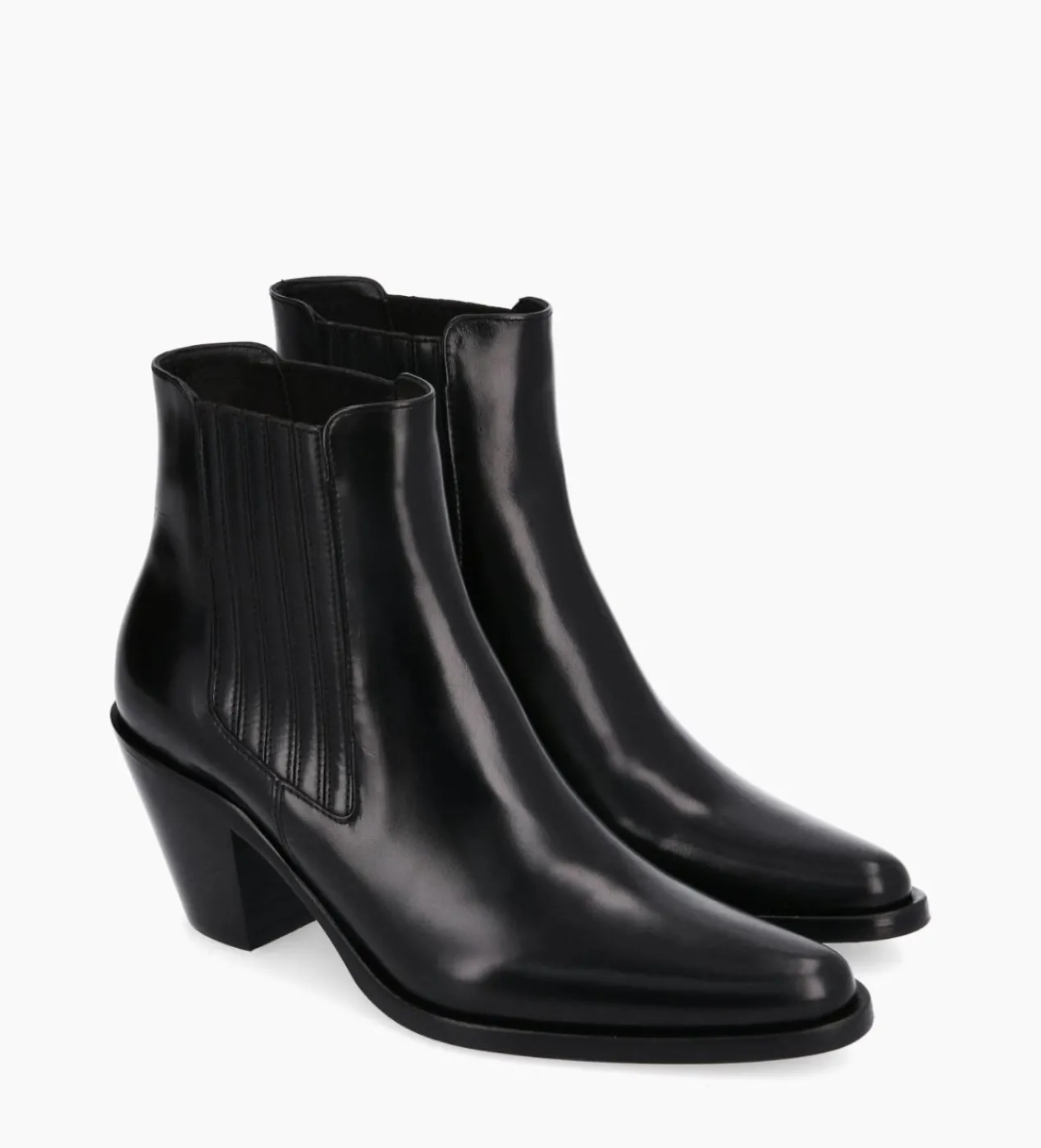 FREE LANCE mixe les codes de la Santiag et de la Chelsea dans une bottine citadine facile à porter. Les Jane, réalisées en cuir lisse noir et dotées de larges élastiques recouverts sur les côtés, affichent une allure élancée et féminine. Bout pointu, talon en biseau de 70 mm et tire-botte, ces bottines fabriquées en France s’enfilent facilement et offrent un maximum de confort au quotidien.