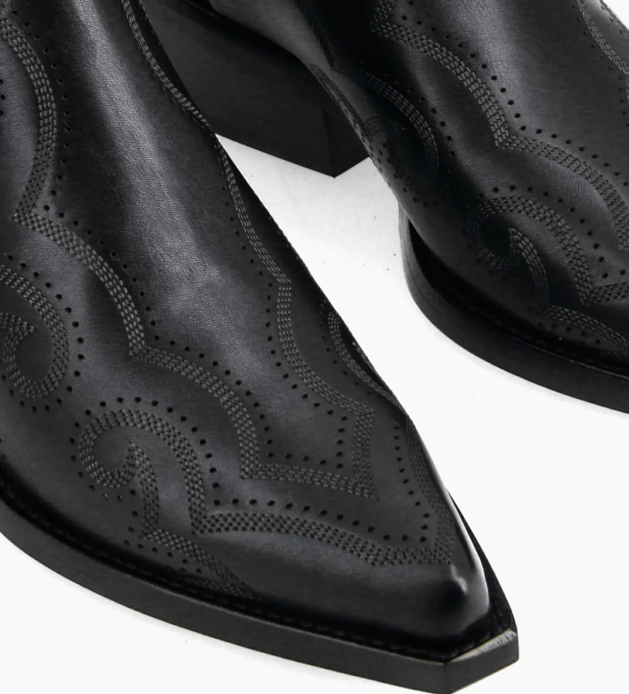 Les nouvelles bottines Calamity offrent une interprétation contemporaine, teintée d’accents rock, de la Santiag traditionnelle. Réalisées en cuir noir selon un cousu Blake, elles affichent une silhouette aux lignes franches ornée de flammes brodées et de perforations délicates. Leur pointe effilée repose sur une trépointe débordante à bout carré pour un effet des plus graphiques. Un talon biseauté complète leur look affûté. Facile à enfiler et à retirer, cette paire est dotée de deux zips métallisés reliés par une fine bride en cuir siglée Free Lance.