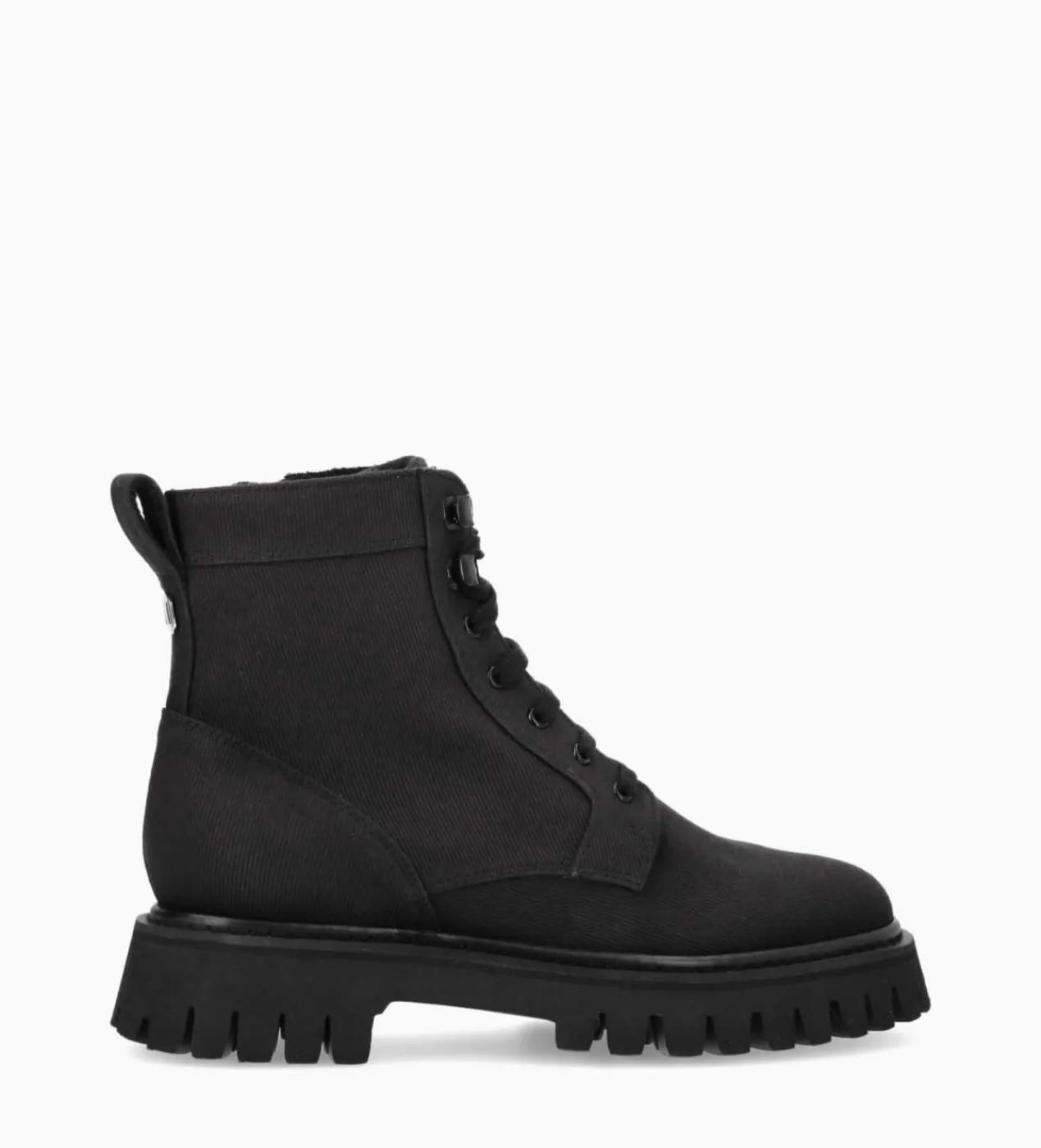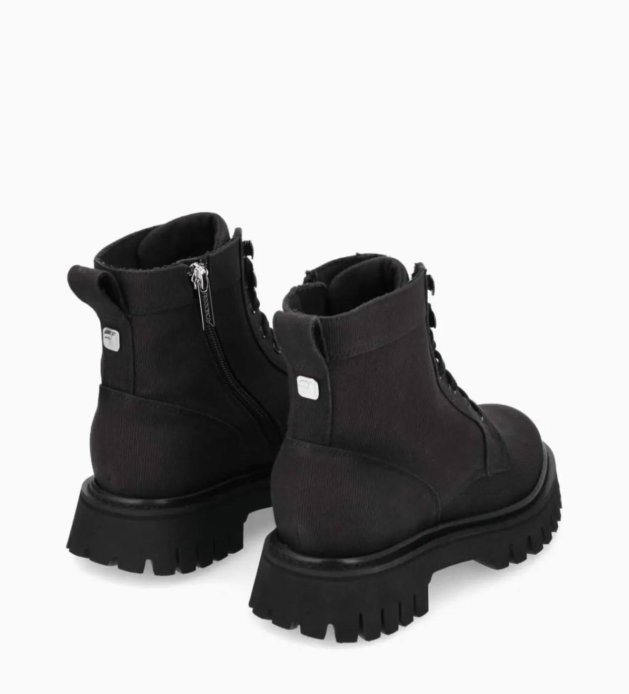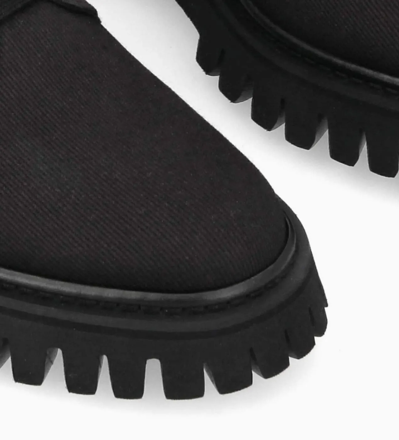 Les Gisèle se distinguent par leur allure tout-terrain twistée par des détails emblématiques qui ont forgé la réputation de la Maison. Dans cette version en twill noir, reposant sur une imposante semelle crantée, ces boots arborent un look résolument rock. Fabriquées en France avec tout le savoir-faire Free Lance, les Gisèle sont pourvues de lacets plats pour un ajustement parfait à votre pied et d’un zip intérieur facilitant l’enfilage. Elles combinent légèreté et confort, vous permettant d’affronter tous les sols avec aisance, tout en affichant un look audacieux.