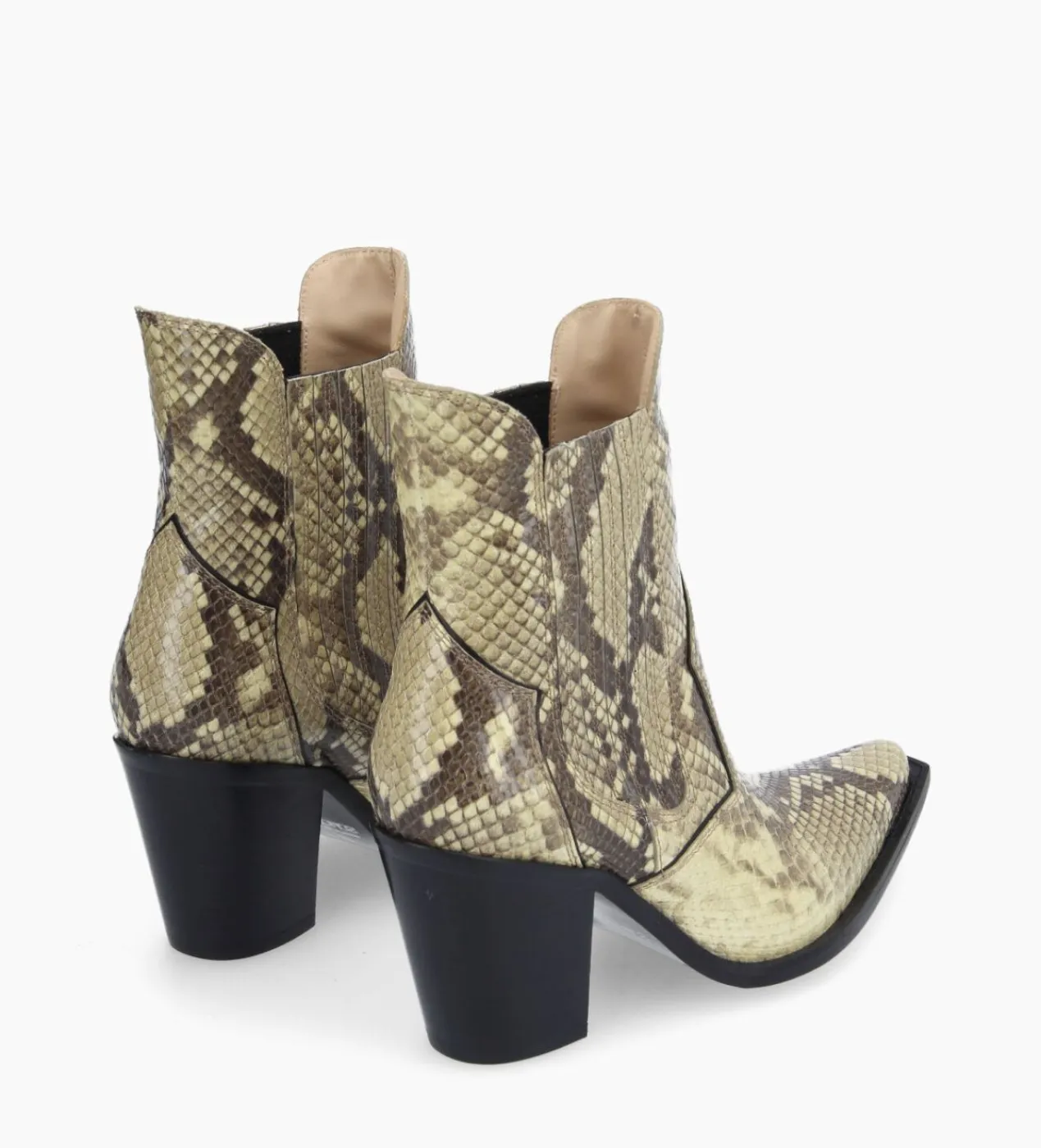 La famille des Sandy s’enrichit de cette magnifique version en cuir effet python naturel assurément audacieux et original. Confectionnées avec soin en France selon le savoir-faire de la Maison Free Lance, ces santiags se distinguent par leur tige élancée et leur talon biseauté alliant le style western à l’allure citadine. Les élastiques latéraux délicatement recouverts facilitent l’enfilage conférant style unique et élégance à ces bottines.