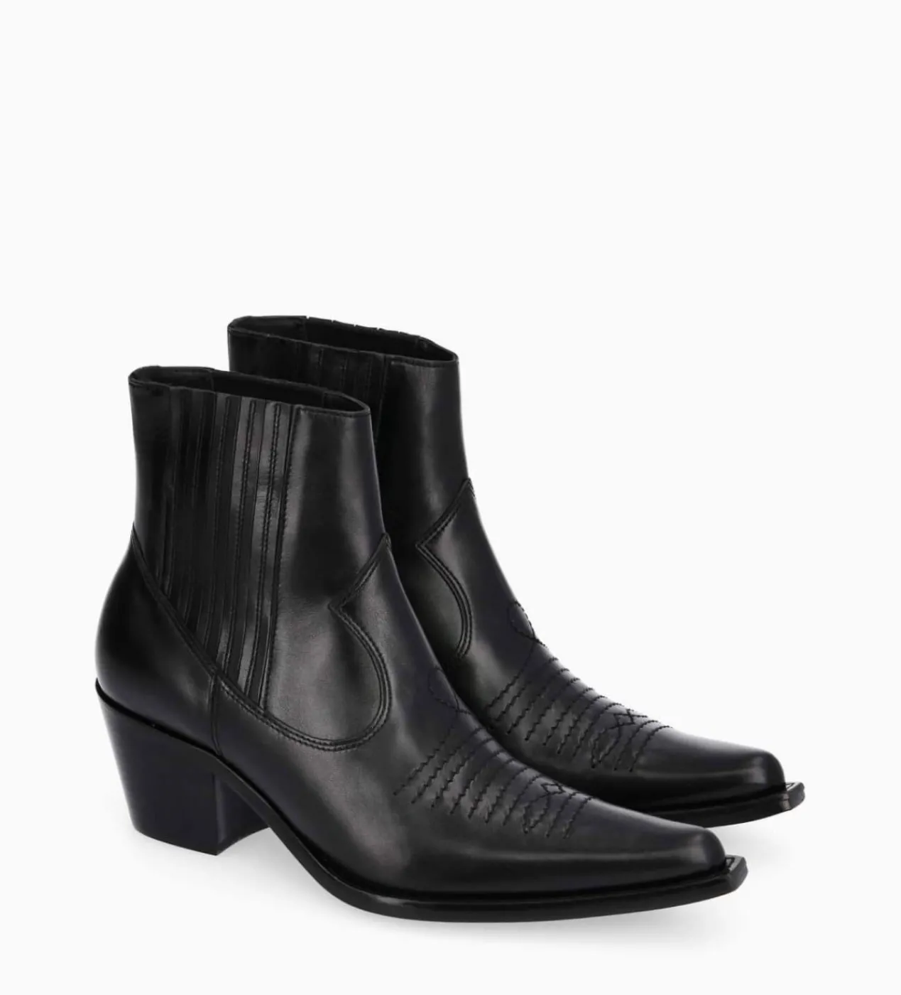 Les Simone se dévoilent dans une version épurée et intemporelle dans un sublime cuir brillant noir. Ces bottines citadines aux lignes acérées, revendiquent fièrement leur inspiration western, avec leur bout franchement pointu posé sur une trépointe graphique, leur talon en biseau et leurs surpiqûres caractéristiques des bottes de cow-boys. Fabriquées en France avec tout le savoir-faire Free Lance, ces santiags vous offrent un confort exceptionnel et s’enfilent facilement grâce à leurs élastiques latéraux recouverts de lamelles de cuir. Ces bottines permettent d’affirmer votre style avec détermination et une pointe d’audace.