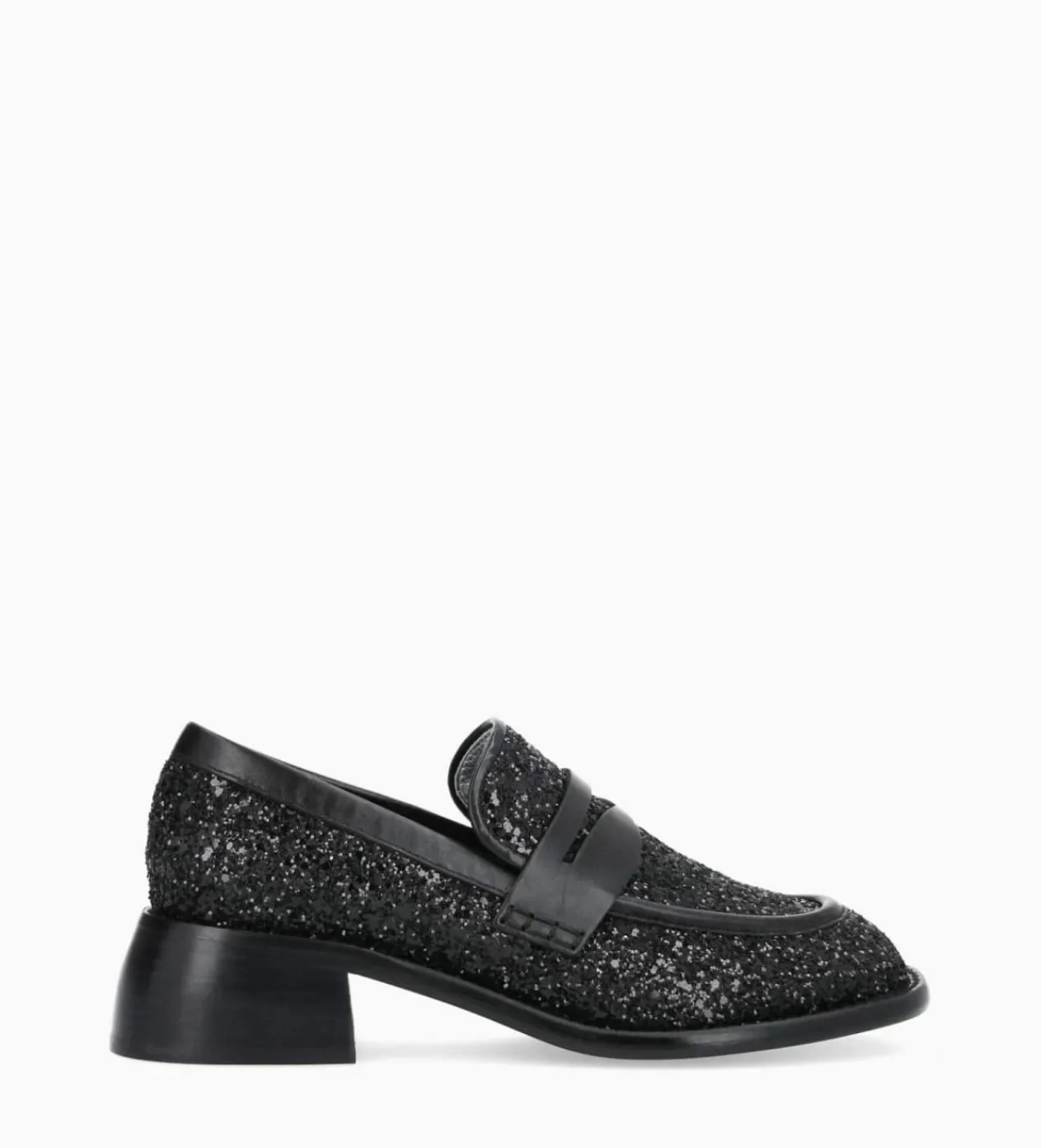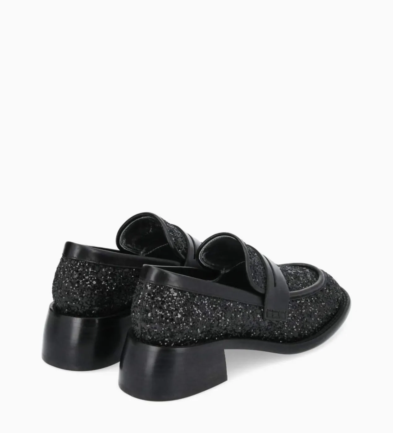 Les Anaïs se parent d’un habit de lumière pour ajouter une touche d’éclat aux tenues les plus chics. Confectionnés dans une somptueuse toile glitter noire, sublimée par un bandeau en cuir lisse, ces mocassins se réinventent avec sophistication. Fabriqués en France avec tout le savoir-faire de Free Lance, ils arborent une silhouette résolument contemporaine avec leur bout carré arrondi, leur trépointe débordante et leur large talon graphique.