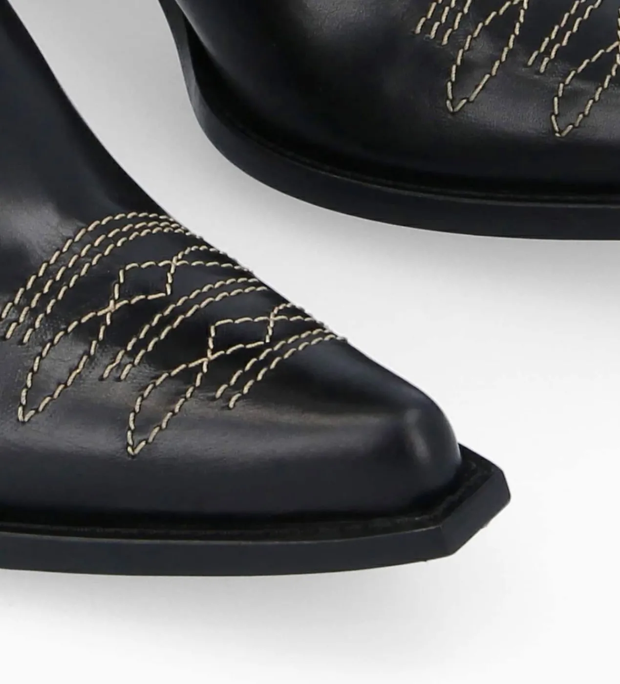 Cette nouvelle Ruby conjugue ses origines western à des lignes urbaines et contemporaines. Une botte en cuir brillant noir aux lignes assumées : bout franchement pointu, trépointe débordante graphique et talon biseauté à souhait pour amorcer la saison de plain-pied. Un jeu de surpiqûres brodées réalisées à la main dans nos ateliers français rythme l’allure. Avec leur talon à la cambrure parfaite elles offrent beaucoup de confort.