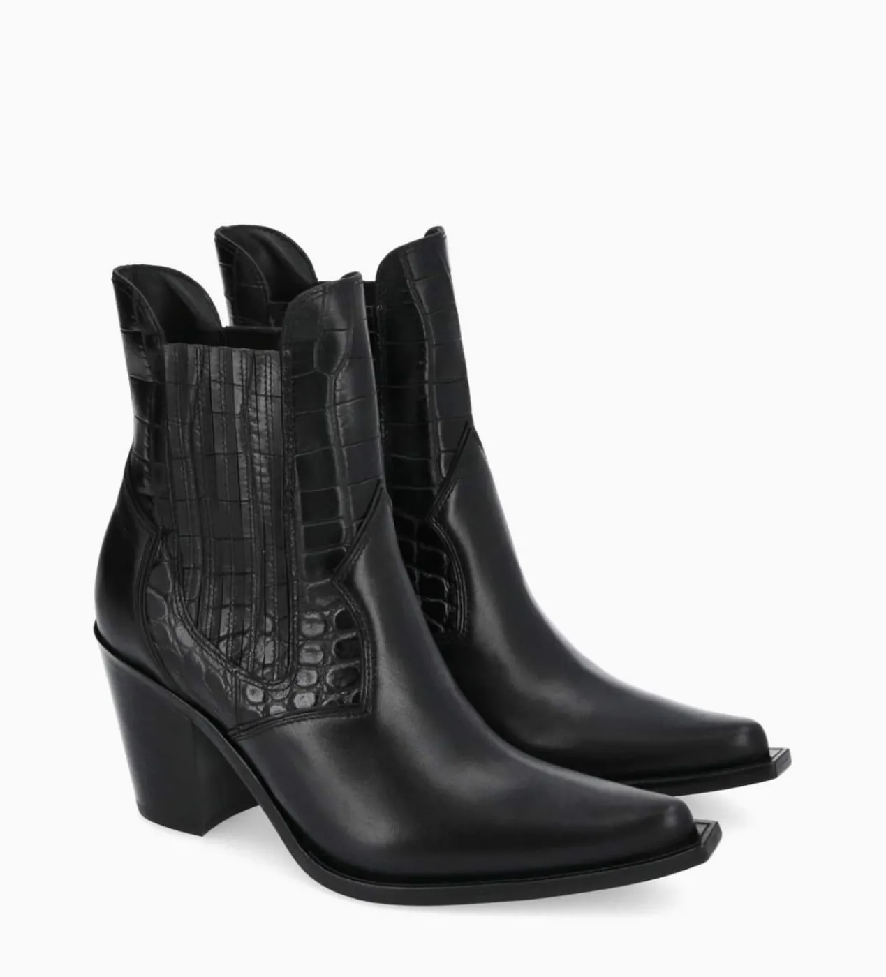 Avec les Sandy, Free Lance dévoile un Chelsea aux accents western affirmés. Ces bottines à la pointe affutée et au talon franchement biseauté se distinguent par leurs empiècements en cuir imprimé croco enveloppant les élastiques latéraux. Fabriquées en France avec tout le savoir-faire de la Maison, ces sublimes bottines incarnent la fusion parfaite entre le style urbain et l’esprit sauvage, agrémentée d’une indéniable touche glam’rock. Les Sandy ajoutent une touche d’élégance racée à toutes vos tenues.