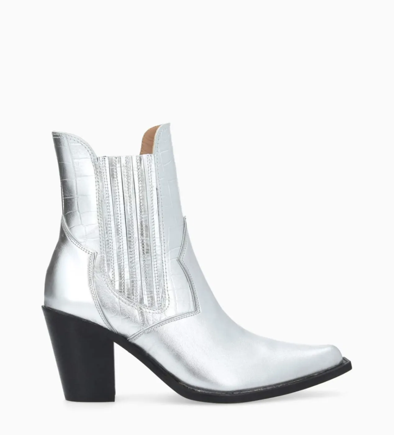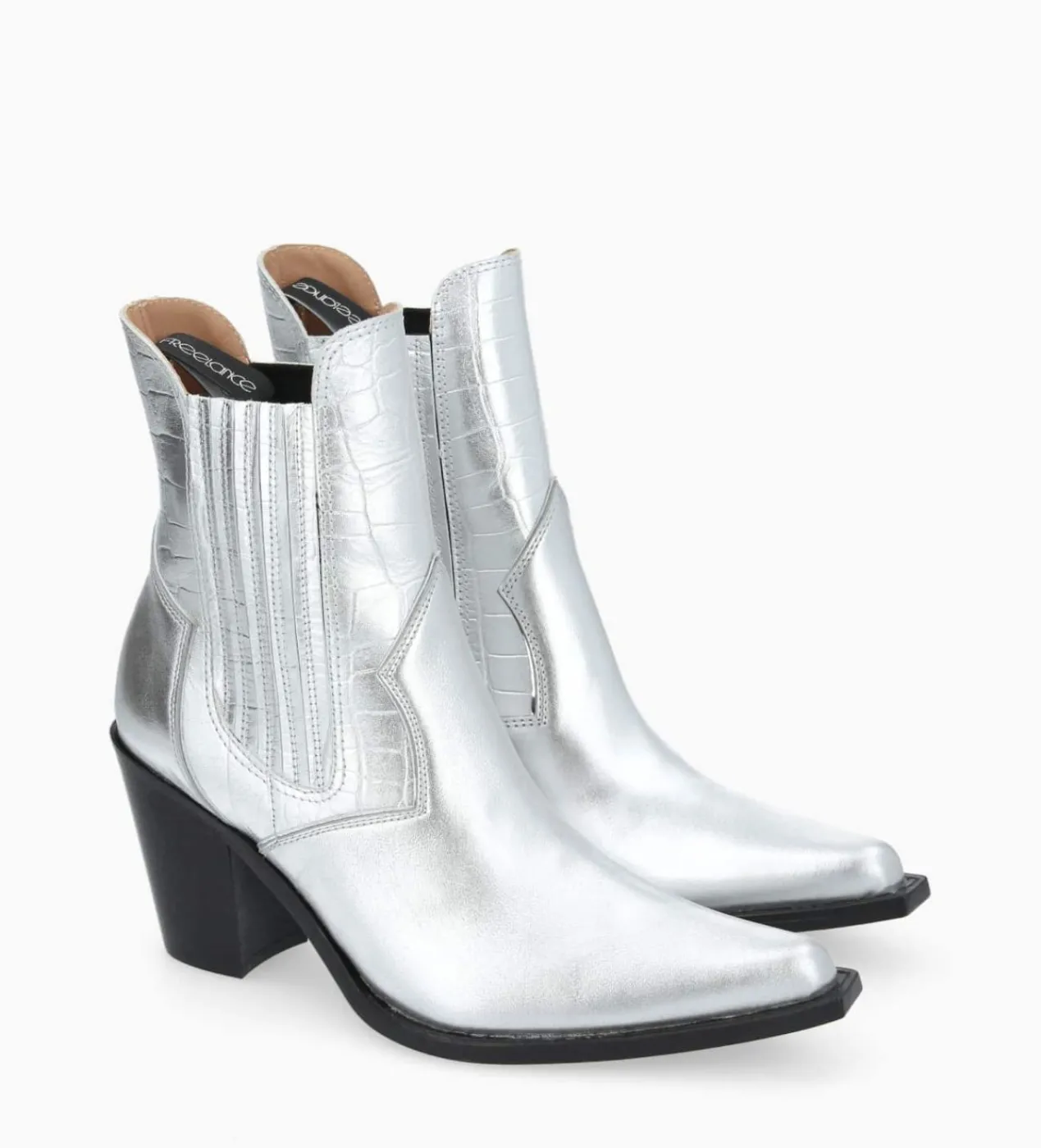 Avec les Sandy, Free Lance dévoile un Chelsea aux accents western affirmés. Ces bottines à la pointe affutée et au talon franchement biseauté se distinguent par leurs empiècements en cuir imprimé croco métallisé enveloppant les élastiques latéraux. Fabriquées en France avec tout le savoir-faire de la Maison, ces sublimes bottines incarnent la fusion parfaite entre le style urbain et l’esprit sauvage, agrémentée d’une indéniable touche glam’rock.