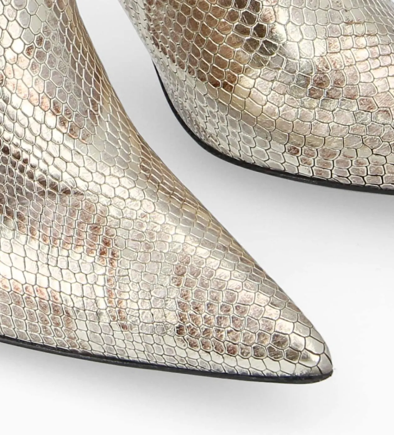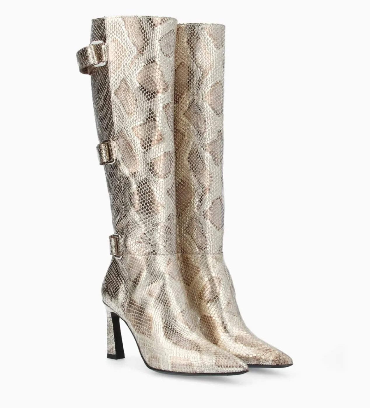 Inspirée des archives de FreeLance, la nouvelle botte à talons Cathy se distingue par son bout pointu et un nouveau talon évasé signature de la maison. Dotée de sangles velcro ajustables à l’arrière de la tige, elle s’ajuste parfaitement au mollet et arbore une silhouette d’une féminité ultime. Fabriquée en France dans un cuir imprimé python doré bouleversant de lumière, elle fusionne l’excentricité et le glamour à l’univers biker, ancré dans l’histoire de la maison.