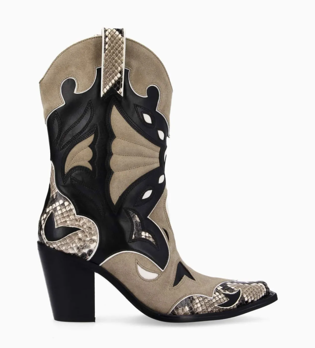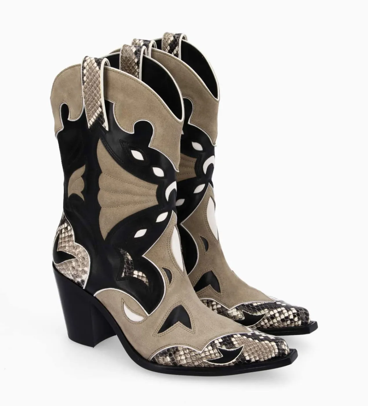 Bottines western beige et noir en cuir lisse, cuir velours et cuir imprimé serpent