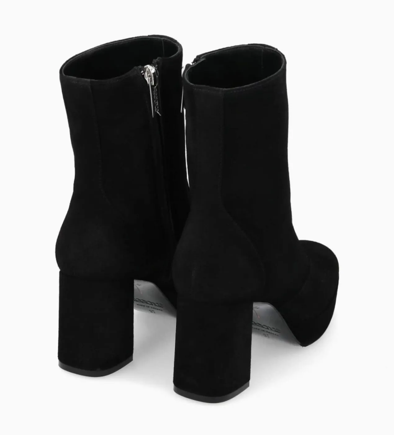Véritable héritage des archives de la maison FreeLance, Carlotta se différencie par son style largement inspiré des années 80. Dotée d’un bout légèrement carré et d’un talon bloc, cette bottine présente une ligne singulière réhaussée par une plateforme de 25mm. Fabriquée en France en cuir velours noir selon les savoir-faire de la maison, Carlotta se distingue tant par son élégance que son caractère intemporel.