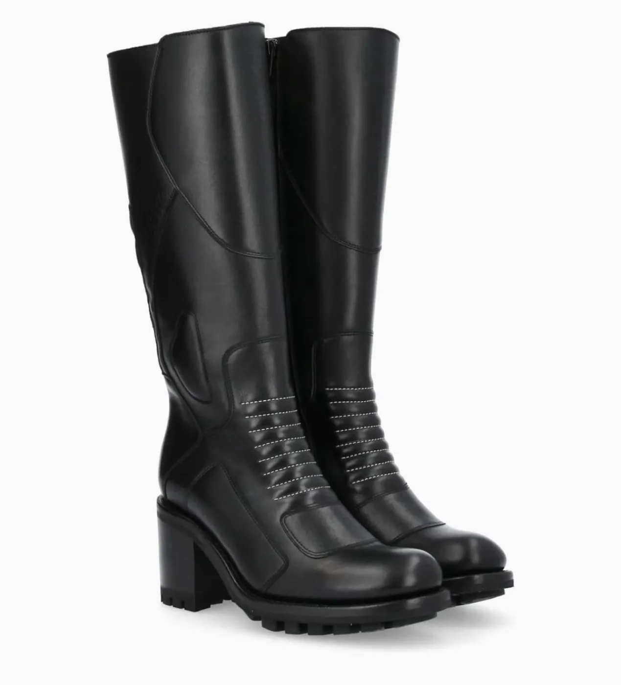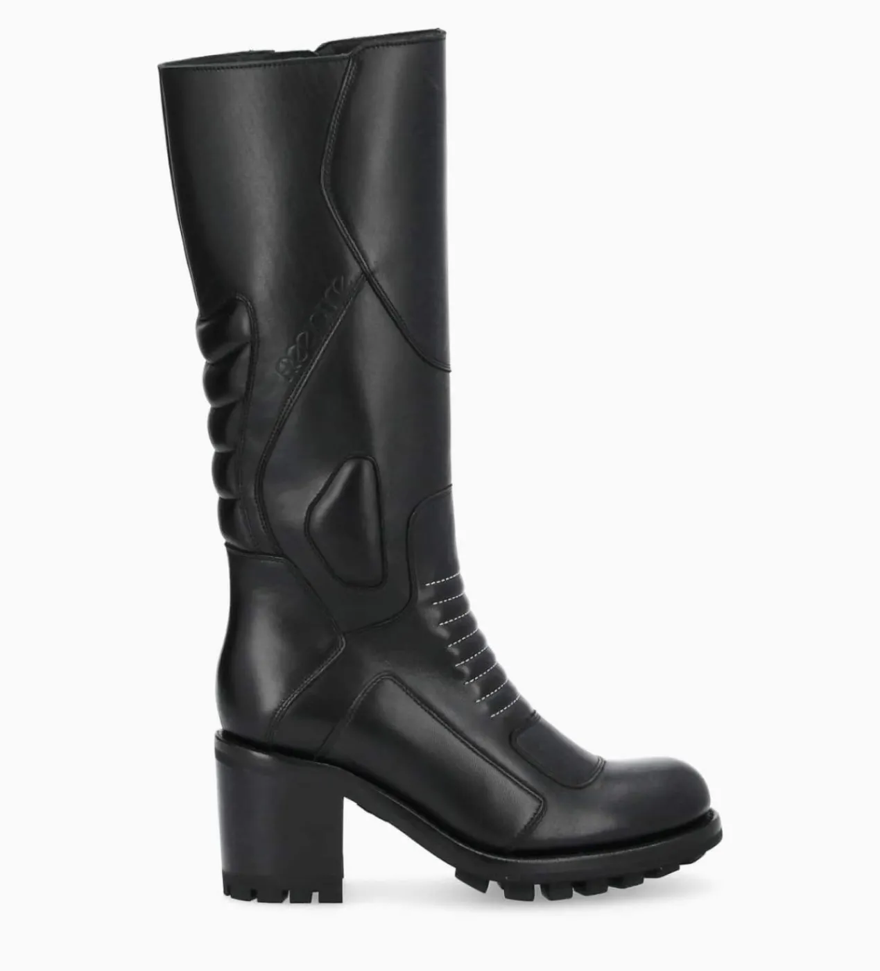 La botte se pare de détails inspirés de l’univers biker avec la Thelma dans une version en cuir lisse noir. Elle dévoile un jeu d’empiècements matelassés et de surpiqûres empruntées aux blousons des motards. Reposant sur l’emblématique semelle crantée de FREE LANCE et confectionnée selon la technique du cousu Goodyear, la Thelma allie une allure audacieuse à une résistance inégalée. Elle apporte une esthétique singulière à chaque tenue.