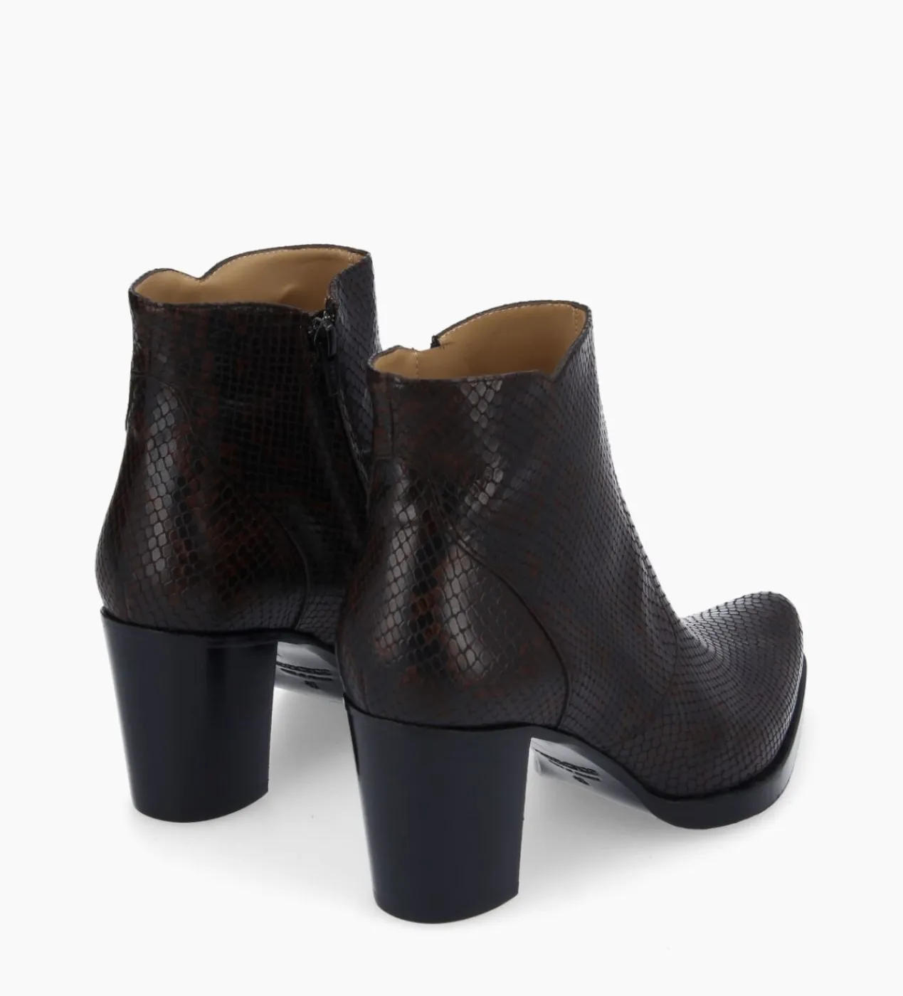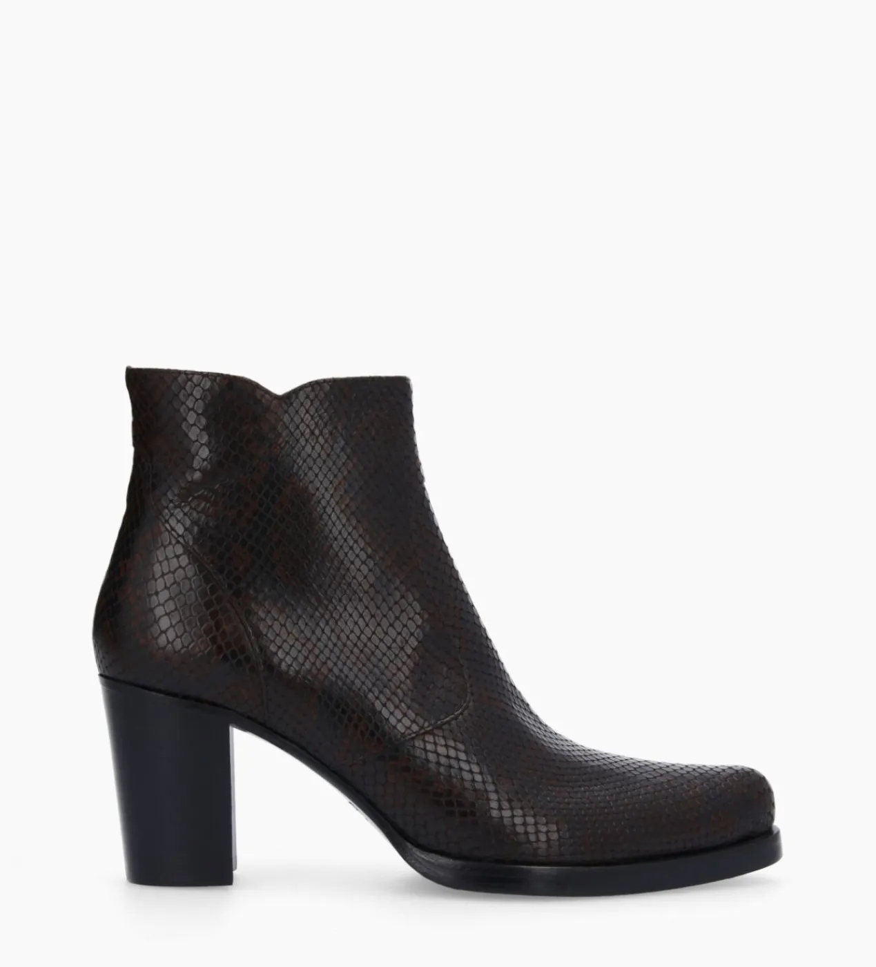Confectionnées dans un cuir imprimé python café, l’intemporelle Paddy assure une silhouette des plus féminines et audacieuses. Fabriquée en France par la Maison Freelance, cette bottine présente une ligne singulière et un talon bloc de 7,5cm, assurant confort en toute occasion. Leurs lignes toutes en douceur se mêlent à un bout mufflée pour leur donnée une allure féminine et citadine pleine de charme et de singularité.