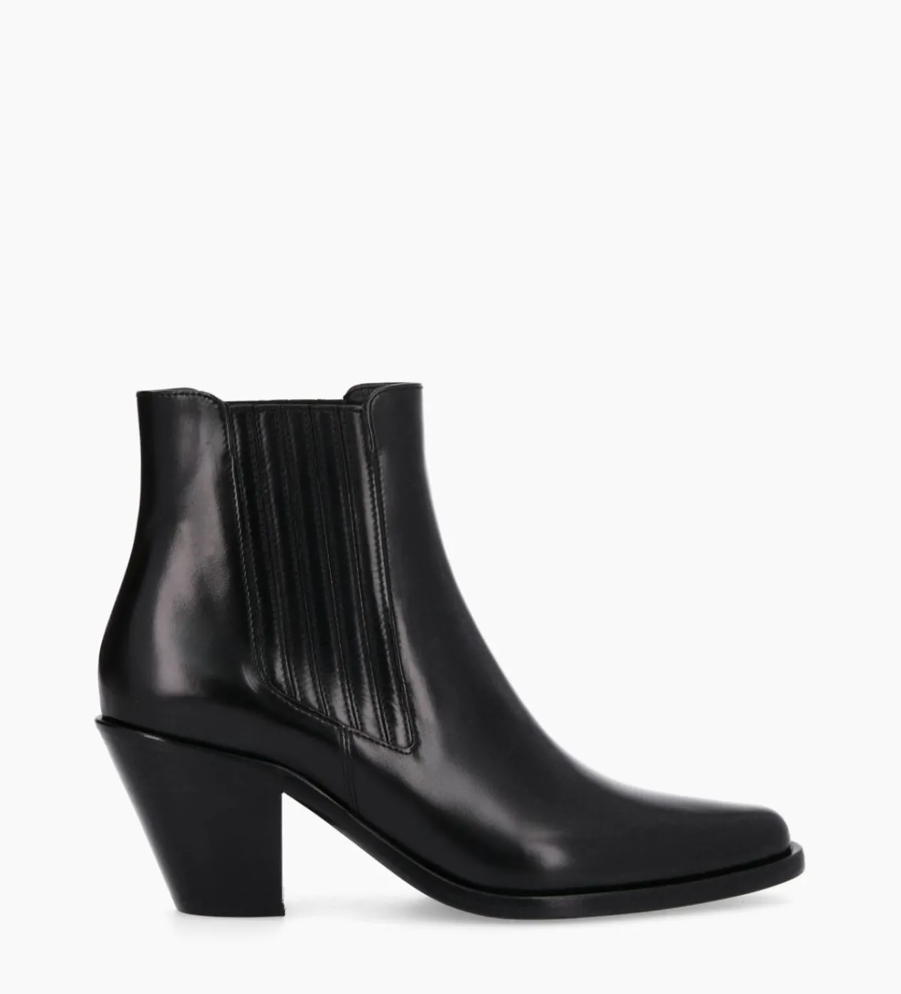 FREE LANCE mixe les codes de la Santiag et de la Chelsea dans une bottine citadine facile à porter. Les Jane, réalisées en cuir lisse noir et dotées de larges élastiques recouverts sur les côtés, affichent une allure élancée et féminine. Bout pointu, talon en biseau de 70 mm et tire-botte, ces bottines fabriquées en France s’enfilent facilement et offrent un maximum de confort au quotidien.