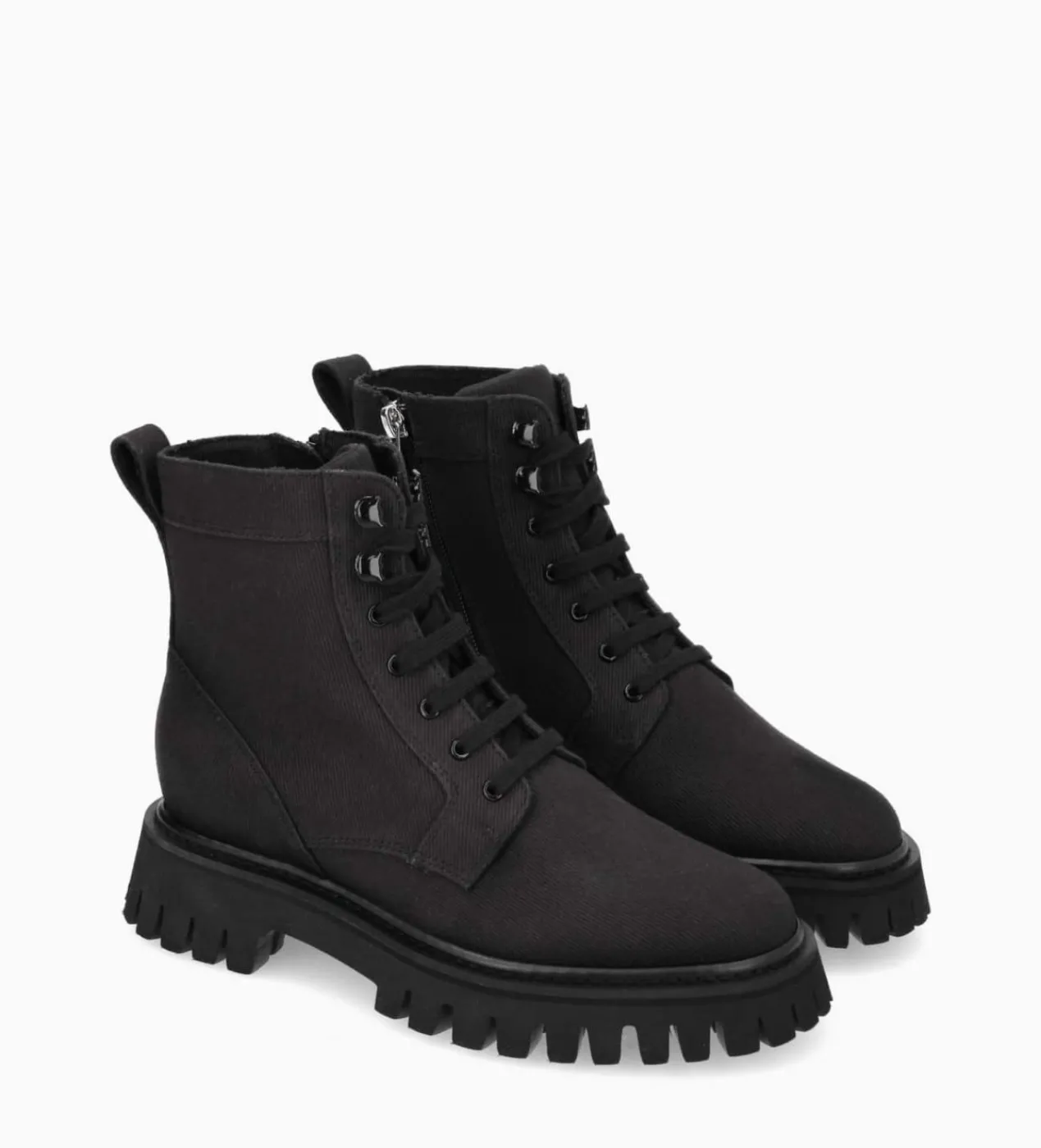 Les Gisèle se distinguent par leur allure tout-terrain twistée par des détails emblématiques qui ont forgé la réputation de la Maison. Dans cette version en twill noir, reposant sur une imposante semelle crantée, ces boots arborent un look résolument rock. Fabriquées en France avec tout le savoir-faire Free Lance, les Gisèle sont pourvues de lacets plats pour un ajustement parfait à votre pied et d’un zip intérieur facilitant l’enfilage. Elles combinent légèreté et confort, vous permettant d’affronter tous les sols avec aisance, tout en affichant un look audacieux.