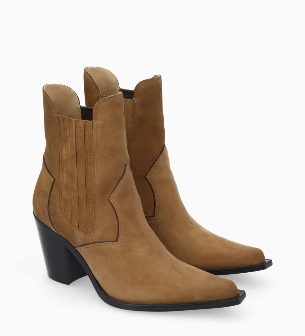 Les Sandy se parent d’un nouveau cuir velours brun pour la saison. Une nouvelle version où la pointe affûtée et le talon biseauté mêlent le style western à l’allure citadine. Confectionnées selon le savoir-faire propre à la Maison FreeLance, les bottines Sandy twistent les codes de la santiag pour une allure aux accents rock, mais néanmoins raffinée grâce à sa silhouette élancée et ses élastiques latéraux finement recouverts.