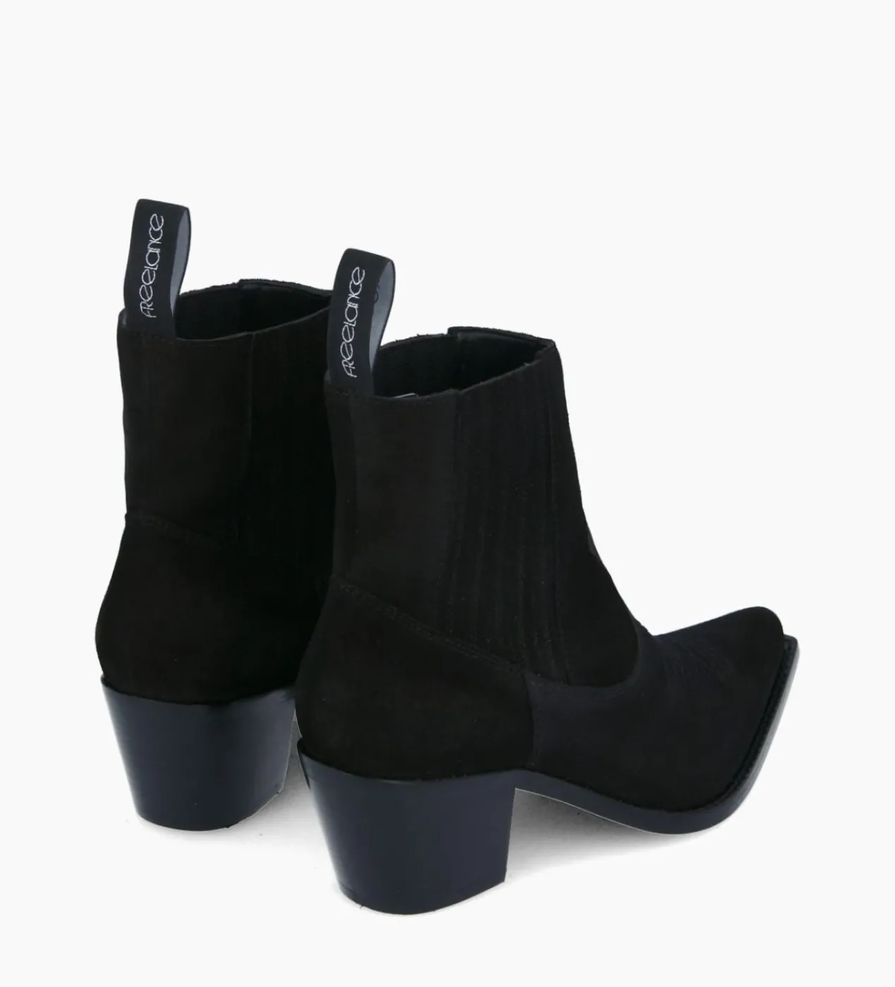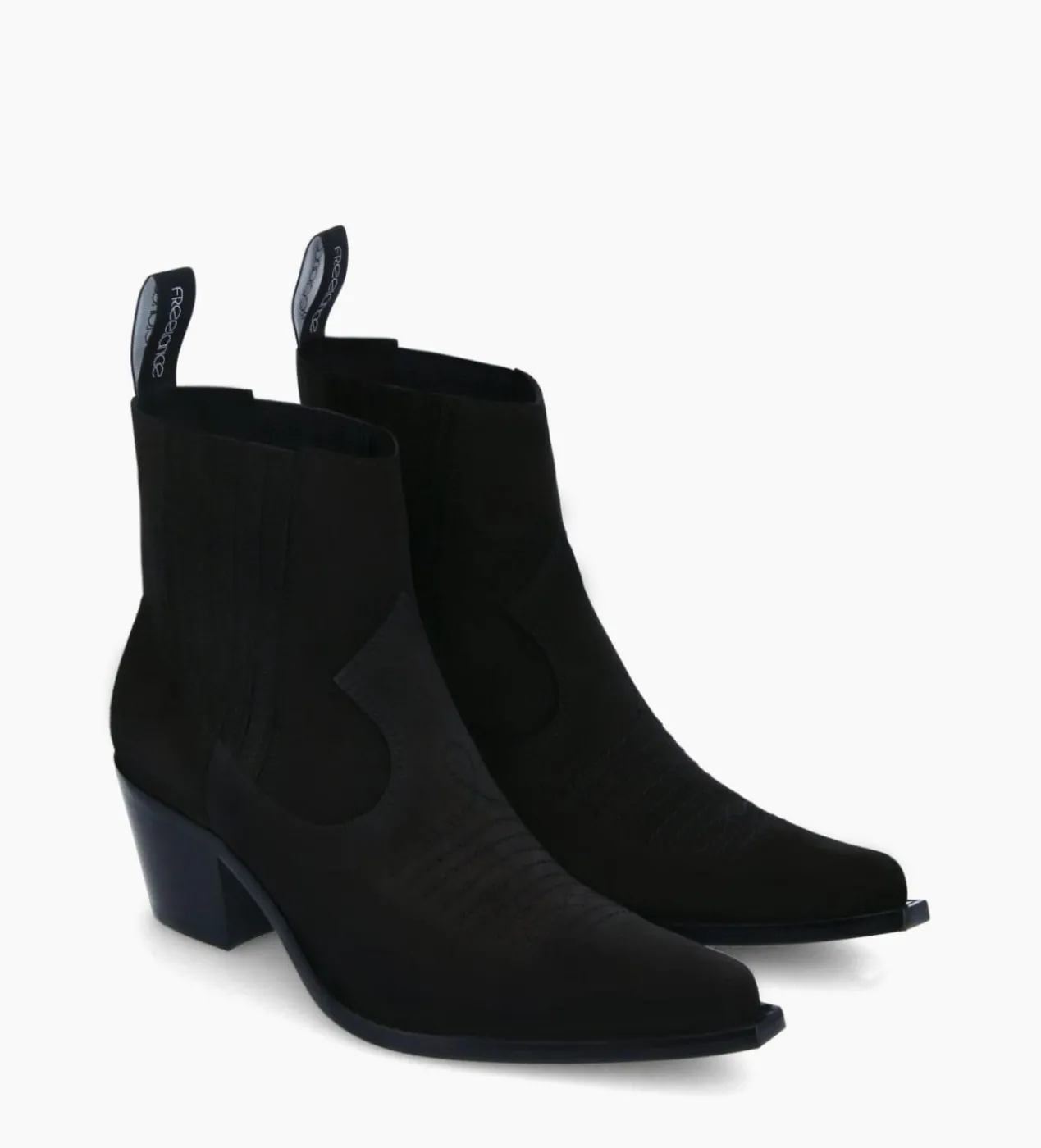 Saison après saison, les bottines western FREE LANCE se réinventent. D’une allure affûtée, les bottines Simone associent un bout pointu à une trépointe débordante graphique, codes de construction de l’univers de la Maison. Avec leurs empiècements élastiques et son talon modéré, elles sont idéales au quotidien. De parfaites alliées de la femme contemporaine en mouvement.