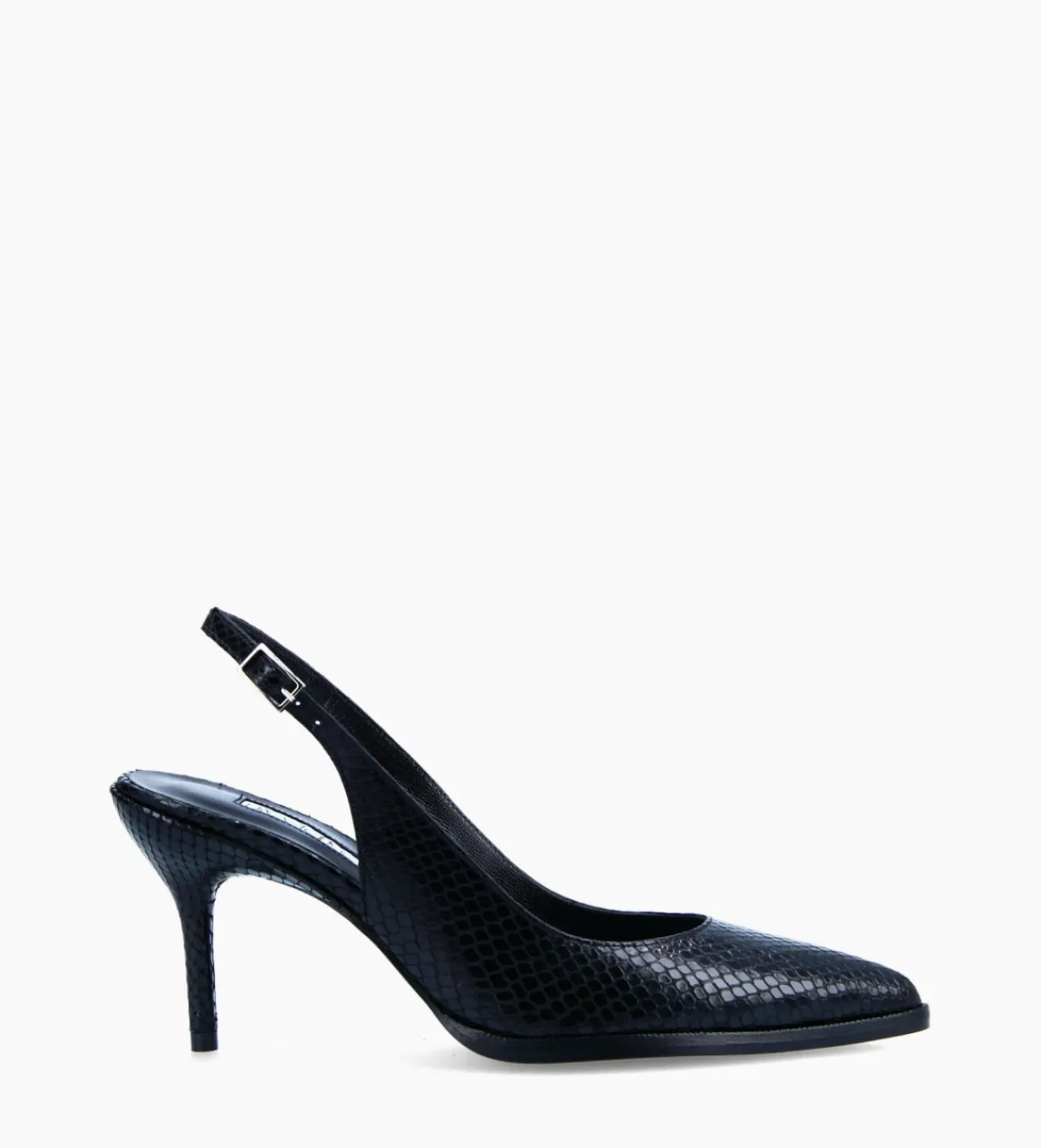 L’escarpin Jamie revisite avec modernité les codes signature de la Maison comme la pointe effilée et le talon aiguille façon tulipe. Fabriquée en France, cette version ultra-féminine séduit par son cuir noir embossé python et sa délicate bride arrière. A l’avant, une trépointe légèrement débordante lui apporte stabilité et une juste touche de caractère. Sa semelle intérieure est rembourrée pour un meilleur accueil et confort du pied.